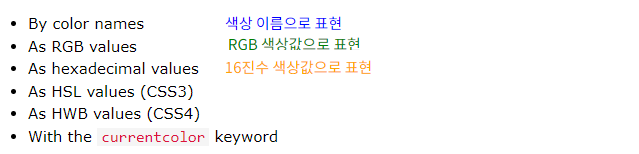 CSS에서 색을 표현하는 방법에는 다음과 같이 여러 방법이 있습니다.