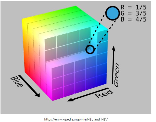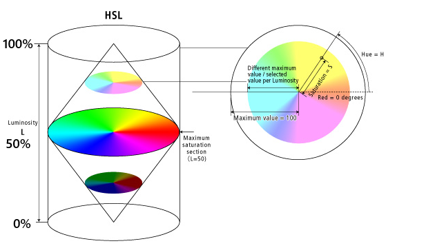 Satuation : 0~100의 채도 값. 100%은 full color, 0%은 회색, 50%은 회색과 원색이 50% 섞인 색이다.
