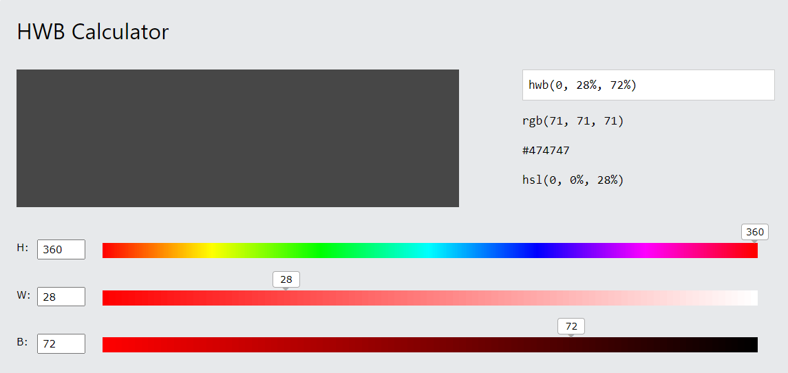 특징: 채도(Saturation) 대신 흰색과 검정색의 혼합 비율로 색상을 조절한다.