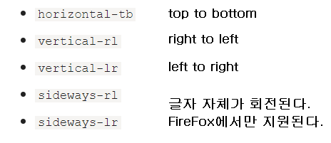 vertical-lr: 텍스트는 위에서 아래로, 블록은 왼쪽에서 오른쪽으로 흐릅니다.