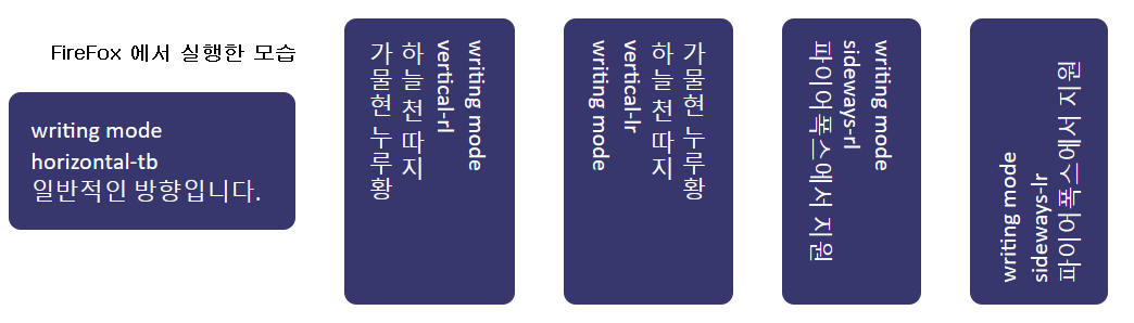sideways-lr: 텍스트는 왼쪽에서 오른쪽으로 (글자는 90도 회전), 블록은 위에서 아래로 흐릅니다.