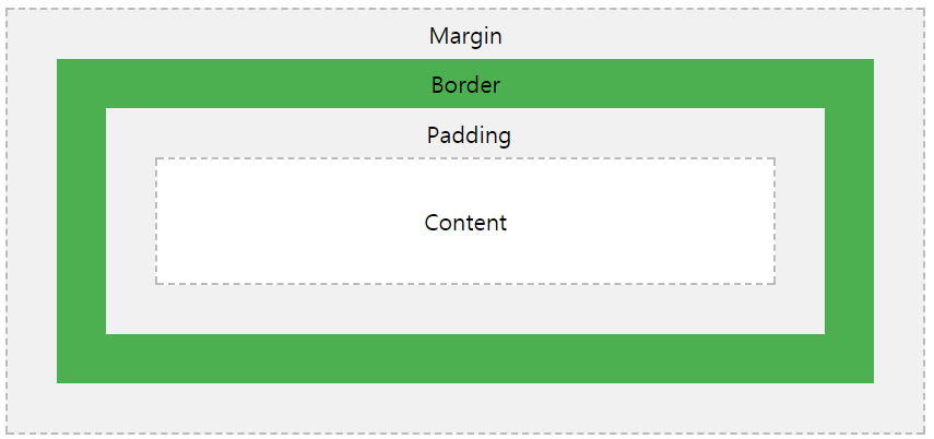 여백, 테두리, 패딩 및 실제 내용으로 구성됩니다. 아래 이미지는 상자 모델을 보여줍니다.